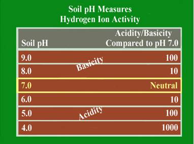 The soil pH scale is logarithmic; meaning that each whole number is a factor of 10 larger or smaller than the ones next to it. For example if a soil has a pH of 7.0 and this pH is lowered to pH 6.0, the acid content of that soil is increased 10-fold. If the pH is lowered further to pH 5.0, the acid content becomes 100 times greater than at pH 7.0. The logarithmic nature of the pH scale means that small changes in a soil pH can have large effects on nutrient availability and plant growth.