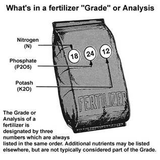 Fertilizer is identified by numbers indicating the percent of each nutrient that is contained in the product. Each fertilizer product might contain any combination of up to 13 nutrients. However, the majority of fertilizer products will have a 3 number identification, such as 5-10-5, 12-12-12, 26-3-3, etc. In all cases, these 3 numbers refer to the percentages of the major nutrients: Nitrogen (N), Phosphate (P2O5), and Potash (K2O) in that order. P2O5 is the fertilizer form of the plant nutrient Phosphorus (P), and K2O is the fertilizer form of the plant nutrient Potassium (K). These three numbers are called the fertilizer analysis or “Grade”. Any additional nutrients that might be contained in a fertilizer are typically listed in smaller print below these three. They will often be in a format similar to 5 S, 0.5 Zn, etc. Fertilizer products that contain some amount of all three major nutrients are often called “complete” fertilizers. Soil test nutrient recommendations are made in the same units (N, P2O5 and K2O). You have to determine how much of a particular fertilizer to apply to meet the recommendation.