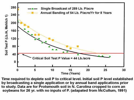 Another study in North Carolina (Fig 1) looked at soil P test drawdown over a long time period. In this study, the investigators applied fertilizer P by two methods. A single application of 289 lb P/ac (662 lb P2O5/ac) was compared to 8 annual banding applications prior to the beginning of the study at a rate of 54 lb P/ac each (a total of 989 lb P2O5). No additional P was applied for 26 years, while growing corn and soybeans. As seen in Fig. 1, it required between roughly 17 and 23 years to reduce the elevated soil P to the researchers designated “critical” soil P level of 44 lb P/ac. Unfortunately, the report did not document the annual yields of corn and soybeans that caused the P test drawdown. However, the nature of both curves in Fig. 1 shows that the soil test drawdown was a little faster in the initial years when the soil test was higher, than at lower levels in later years. In other words, as a soil test level approaches its “base-line” it is more difficult to change it.