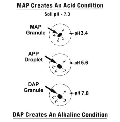 pH Effect: Diammonium phosphate (DAP), monoammonium phosphate (MAP), and ammonium polyphosphate (APP) are common ammoniated phosphorus fertilizers. While the soil pH has an effect on the availability of the P from these sources, the fertilizer also has an effect on the soil pH in the immediate area of application. In broadcast applications the variable pH effects of the different P sources occurs at all times, but any practical effects on crop performance is limited to band applications. In alkaline soils MAP and APP can have an advantage over DAP.